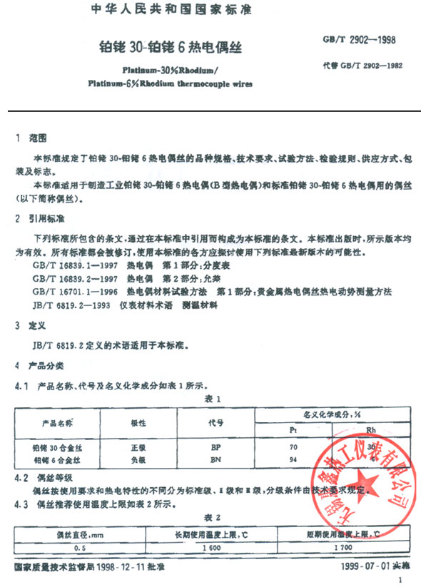B分度號(hào) 鉑銠30-鉑銠6熱電偶標(biāo)準(zhǔn)